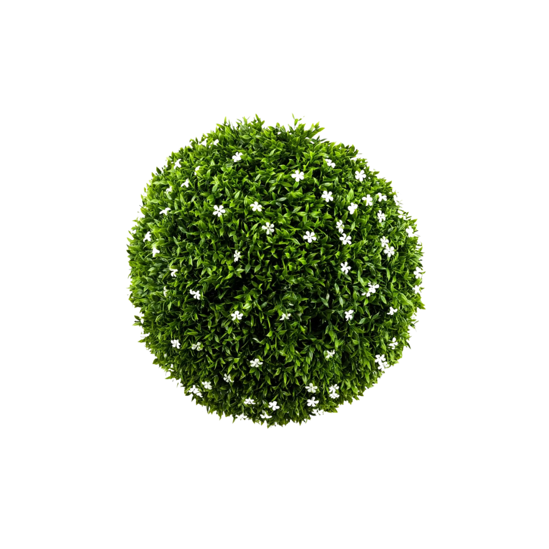 La bola boj artificial Alba es una esfera decorativa que se vende en dos tamaños diferentes, 33cm y 38cm de diámetro. Está diseñada para imitar la apariencia del boj real, y está hecha de hojas de 100% HDPE, lo que garantiza su durabilidad y resistencia a la intemperie.